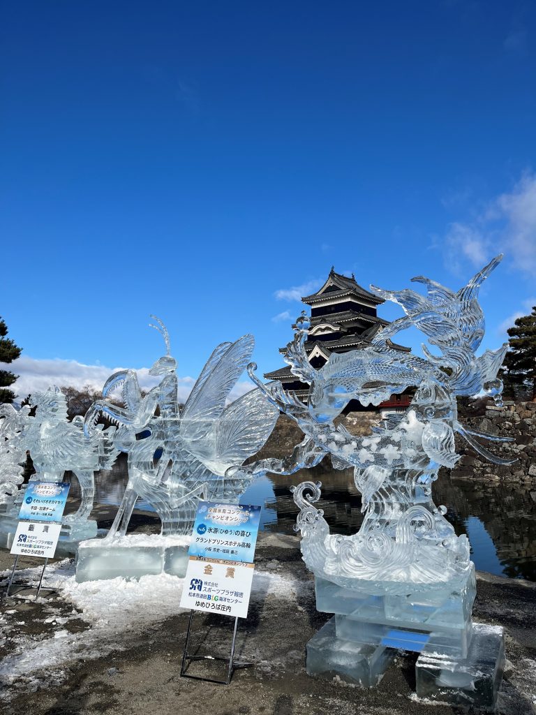 全国から集まった氷彫師による大胆で繊細な氷の彫刻が、冬の北アルプスと松本城を背景に立ち並ぶ氷の祭典です。