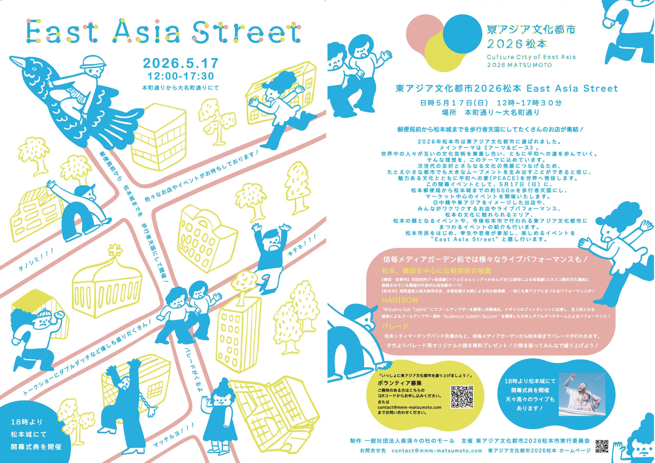 5月17日(日)は東アジア文化都市2026松本の開幕日です。その幕開けを飾る開幕イベント「East Asia Street」では、松本の中心市街地を舞台に、東アジアの文化が体感できる多彩なプログラムを展開します。本町通りから大名町通りにかけて歩行者天国が広がり、飲食や物販、ワークショップなどさまざまなブースが立ち並びます。地域の魅力と東アジアの文化が交差する、にぎわいあふれる空間が創出されます。